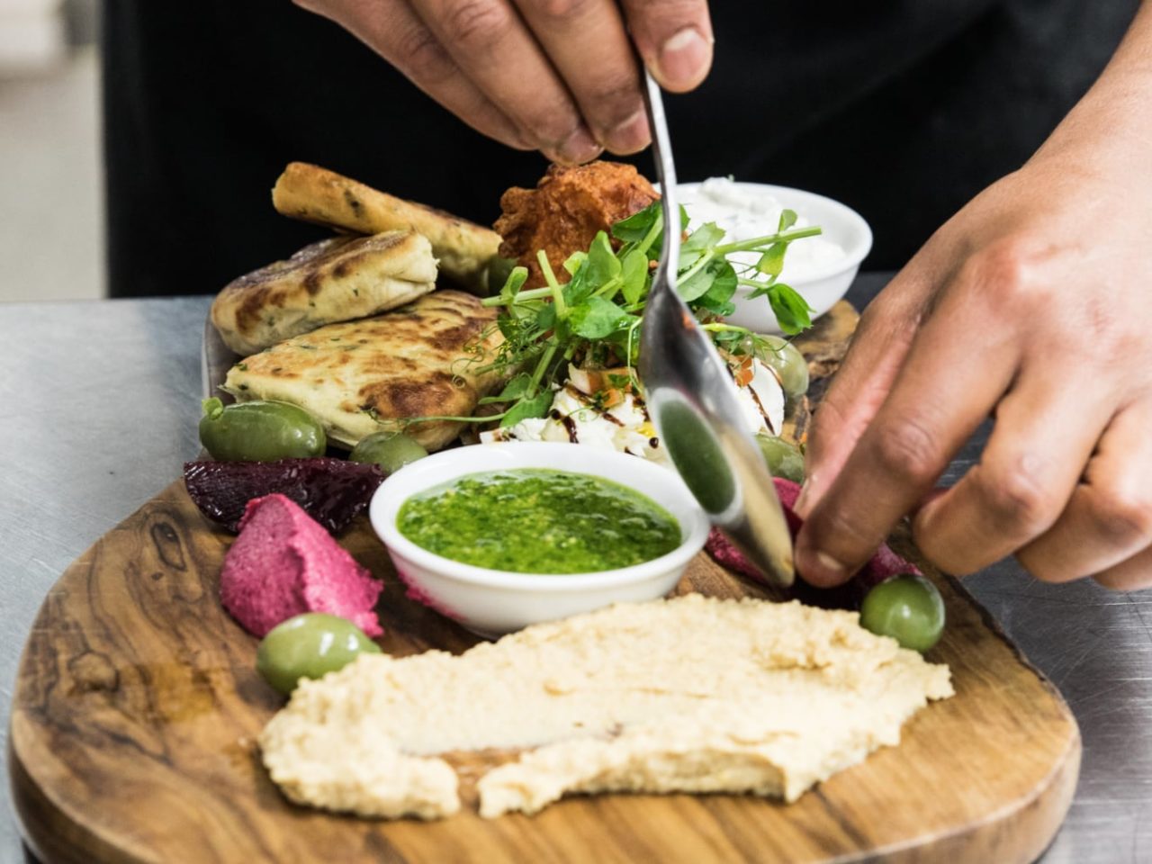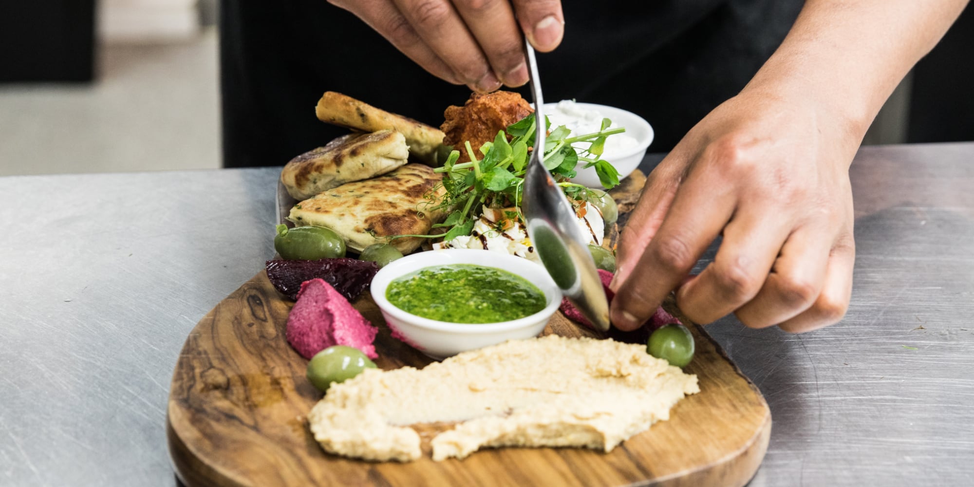 Vegetarian platter: Red pepper hummus, basil and pine nut pesto, olives, sun-dried tomatoes, mozzarella £16